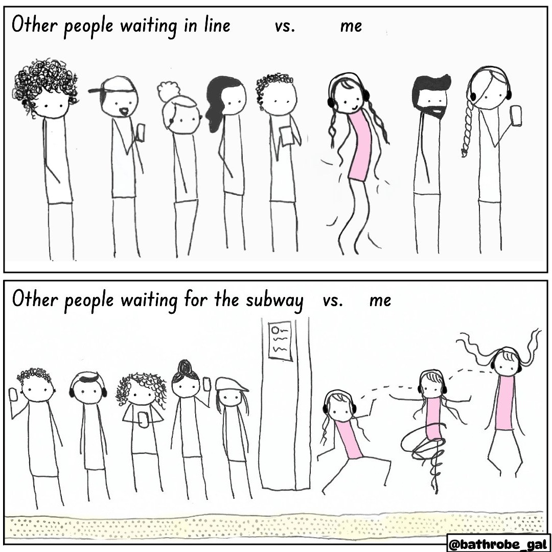 I once lived in NYC. Big cities are overwhelming & intense in so many ways, but one nice thing about living among so many people is that people generally donât care what you do as long as you donât bother anyone. This gave me permission to be in my natural state, long before I understood the reason behind my bodyâs need to move. I spent many hours waiting for trains pacing or dancing around or in patterns following the floor tiles, sometimes humming quietly under my breath, taking care of myself in a way I didnât understand.
