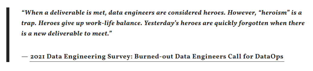 Another survey of over 600 data engineers and managers found that nearly all of them (97%) reported feeling burnt out, primarily due to time spent fixing errors, maintaining data pipelines, and constantly playing catch-up with stakeholder requests. Nearly 90% reported frequent work-life disruptions. 70% said they were likely to leave their current company within a year, and almost 80% were considering leaving the field altogether.