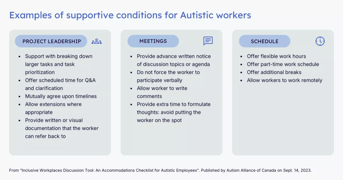 Figure 1. Examples of supportive conditions for Autistic employees from a 2023 report by Autism Alliance Canada. It is important to note that Autistic employees and employers can work together to identify the supports that might work best.