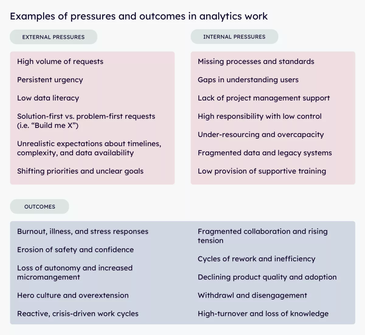 The tendency for analytics workplaces to be top-down, reactive, chaotic, transactional, and overburdening clearly isnât workingânot for our people, and not for our products. Weâve got more than enough burned out workers and leaders, and more than enough underused products to prove it. And Iâm only seeing signs that analytics (and tech more broadly) might be becoming even more unsustainableâfrom 996 culture, mandatory RTO policies, pressure to upskill for AI, low data readiness for AI, to the defunding of DEI.